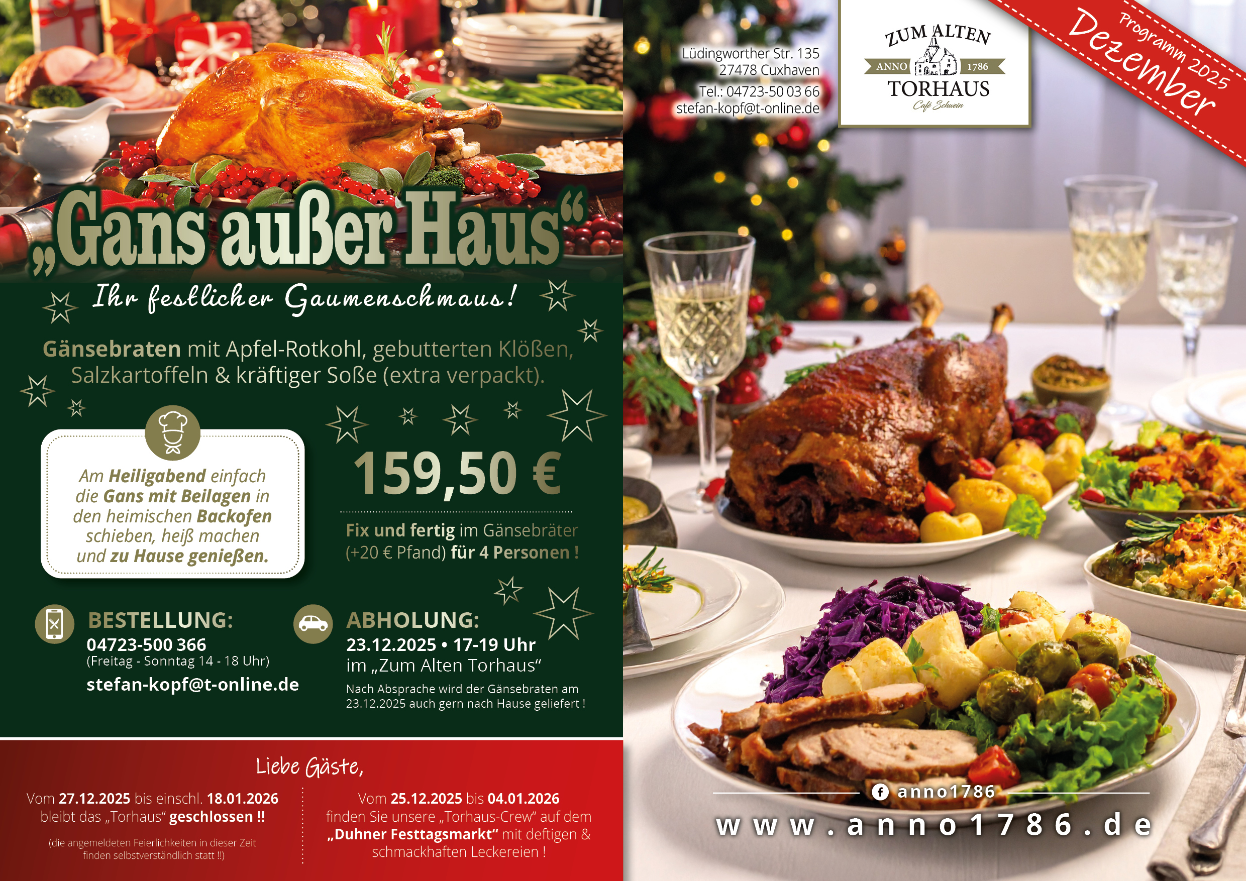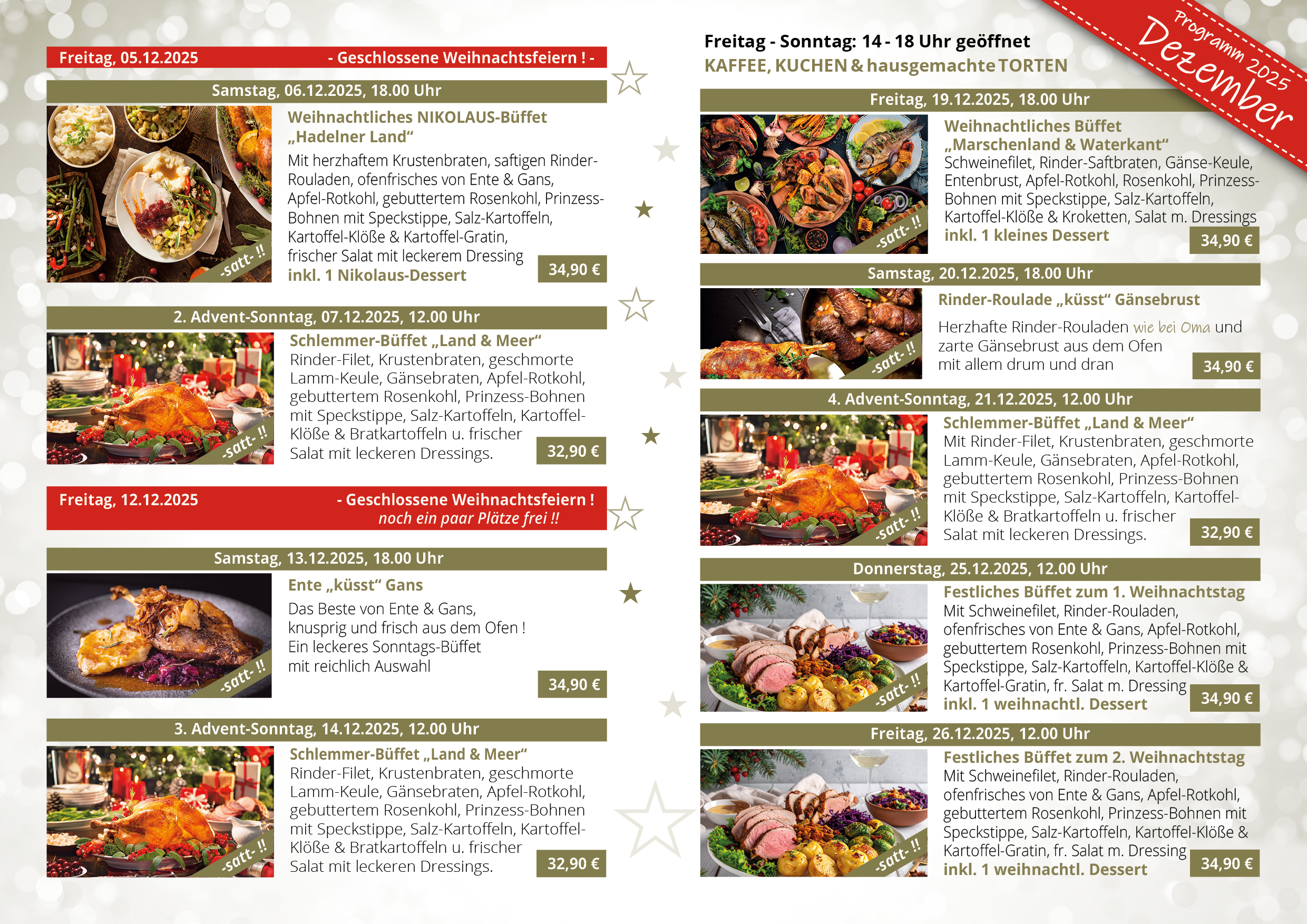 Und selbstverständlich darf auch richtig deftig geschlemmt werden. Ob zur Grünkohlzeit, Brunch zu Ostern, Maischollen satt, zur Spargelsaison tolle Spargelgerichte, im Juni unsere Matjes-Tage, die beliebten Grill-Events im Sommer, den Wildwochen im Herbst , über die Martinsgans-Zeit bis hin zum Jahresausklang mit einer schönen Auswahl an weihnachtlich bezogenen Angeboten.