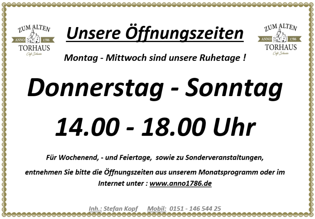 Das 1786 erbaute Torhaus, welches durch den Vorbesitzer auch seit mehr als 14 Jahren bekannt ist unter dem Namen „Cafe´ Schwein“, lädt ein zu leckerem hausgemachtem Kuchen und leckeren selbstgemachten Torten, frischem Kaffee, Kaffee-Spezialitäten und natürlich Tee.